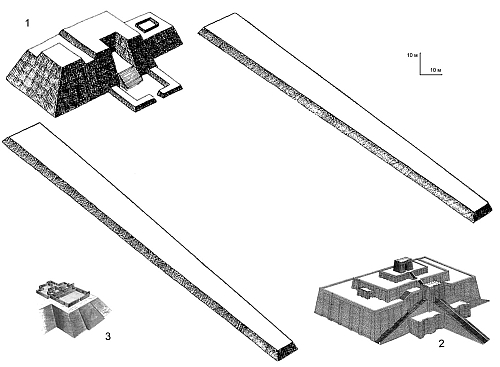 вероятно, являлись платформами под храмы. Длинная насыпь вела